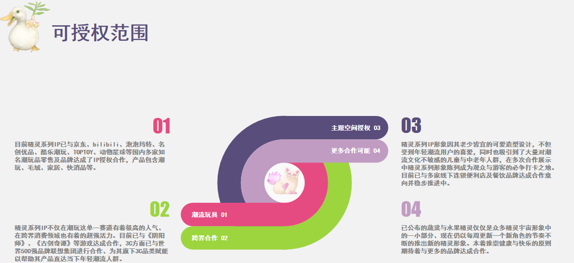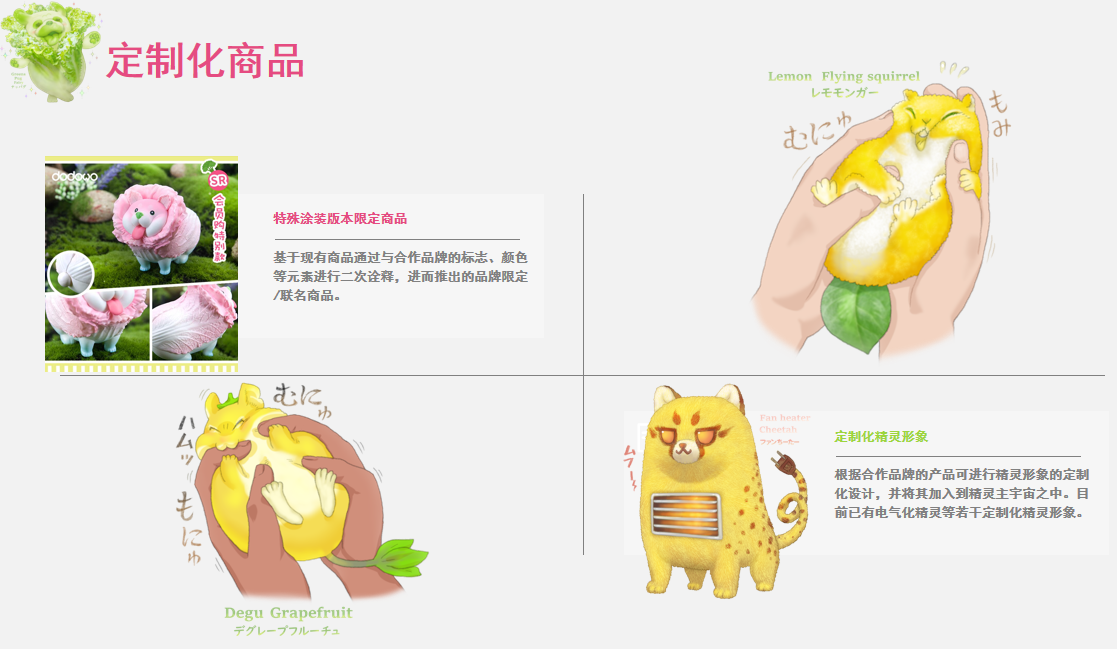 公司成立以来,不断与国内外知名IP合作,先后创作出蜜桃猫、啾之回忆、蔬菜精灵、猪小屁、灵笼等系列的盲盒公仔或雕像产品,并与泡泡玛特、tokidoki、52toys、IP小站、十二栋文化等公司达成战略合作,完善了从IP孵化到周边产品的研发与生产,再到生产销售的商业布局,打造出新周边衍生品经营的闭环模式。